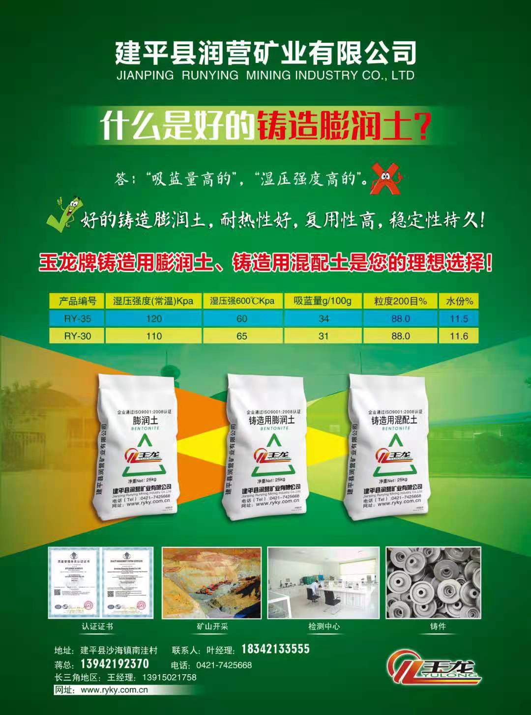 建平縣潤營礦業(yè)有限公司創(chuàng)立于2009年,主要從事膨潤土礦的開采加工及其膨潤土產(chǎn)品的的銷售業(yè)務。公司位于中國膨潤土之鄉(xiāng)遼寧省朝陽市建平縣,緊鄰葉(柏壽)天(義)線公路和(赤峰至錦州以及承德至錦州)鐵路,可直接連接天津、大連、錦州和營口鲅魚圈港,交通運輸十分便利。公司占地面積15萬平方米,擁有高質(zhì)量的膨潤土主體礦山及合同礦山多座,可采儲量超過1000萬噸公司現(xiàn)已形成15萬噸的年開采和產(chǎn)品加工能力。公司產(chǎn)品廣泛用于鑄造、建筑(連續(xù)墻和基樁工程、盾構工程、頂管工藝)、鉆井泥漿(石油和地質(zhì)勘探鉆井泥漿和HDD水平定向鉆進)、冶金球團、環(huán)保(垃圾消納場防水隔離層)、造紙、干燥劑、寵物墊料(貓砂)等領域。公司生產(chǎn)的"玉龍牌"膨潤土產(chǎn)品得到了國內(nèi)外廣大客戶的認可。公司擁有完備的實驗室設備和有經(jīng)驗的技術人員,除對生產(chǎn)的產(chǎn)品進行實時監(jiān)控,以保障產(chǎn)品的質(zhì)量外,還為新產(chǎn)品的開發(fā)、研制提供了可靠的技術保障。公司已經(jīng)通過了ISO9001(2008版)質(zhì)量認證。潤營公司與國內(nèi)外著名膨潤土廠商有著廣泛的合作和技術交流,在總結國內(nèi)外膨潤土生產(chǎn)、加工、使用的經(jīng)驗及對當?shù)嘏驖櫷临Y源認識的基礎上,潤營公司在產(chǎn)品技術指標的制定、生產(chǎn)工藝流程的設計及設備的選型等方面均有獨到之處。